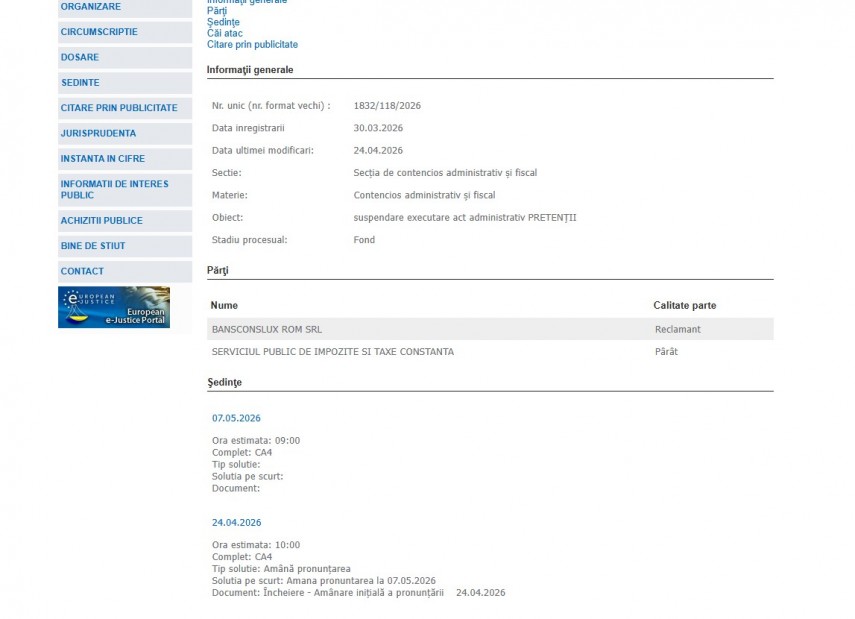 Pe rolul Tribunalului Constanța a fost înregistrat la data de 30 martie 2026 dosarul 1832/118/2026 la Secția de Contencios Administrativ și Fiscal ce are ca obiect „suspendare executare act administrativ PRETENŢII“. Stadiul procesual este fond.Părți în dosar sunt Bansconslux Rom SRL –reclamant și Serviciul Public de Impozite și Taxe Constanța – Pârât.
