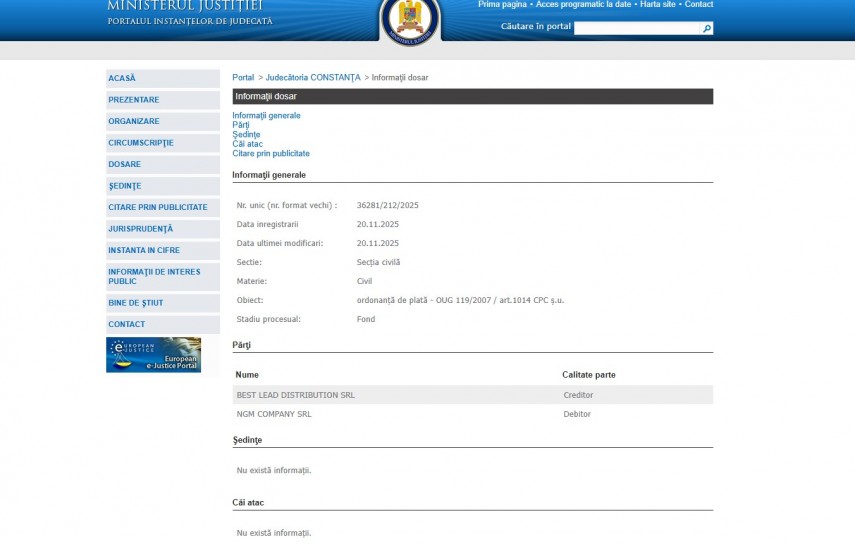 Pe rolul Judecătoriei Constanța se află dosarul cu numărul de înregistrare 36281/212/2025 la Secția Civilă. Dosarul are ca obiect - ordonanţă de plată - OUG 119/2007 / art.1014 CPC ş.u. și se află în stadiul procesual de fond.Părți în dosar sunt Best Lead Distribution SRL - Creditor și NGM Company SRL – debitor.