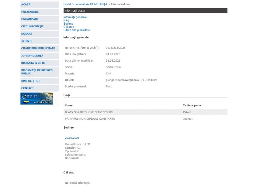 Pe rolul Judecătoriei Constanța a fost înregistrat dosarul 3438/212/2026 la data de 4 februarie 2026. Dosarul a fost înregistrat la Secția Civilă și are ca obiect „plângere contravenţională DPLC 443039“. Dosarul este în stadiul procesual – fond și ultima modificare a fost efectuată la data de 4 februarie 2026.Părți în dosar sunt Black Sea Offshore Services SRL – petent și Primarul Municipiului Constanța – intimat.