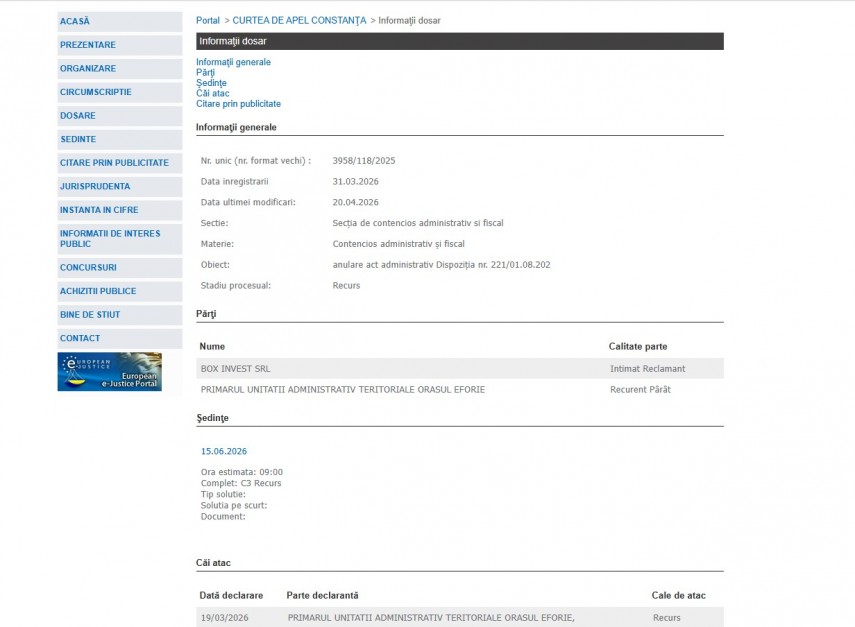 Pe rolul Curții de Apel Constanța a fost înregistrat la data de 31 martie 2026 dosarul 3958/118/2025 la Secția de Contencios Administrativ și Fiscal ce are ca obiect „anulare act administrativ Dispoziţia nr. 221/01.08.2025“. Stadiul procesual este recurs.Părți în dosar sunt Box Invest – Intimat Reclamant și Primarul Unității Administrativ Teritoriale Orașul Eforie – recurent pârât.