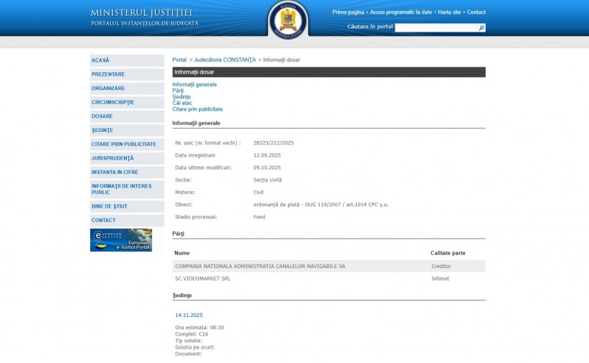 Părți în dosar sunt Compania Națională Administrația Canalelor Navigabile SA – creditor și SC Videomarket SRL – intimat.
