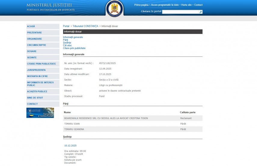 Justiție Constanța Când va avea loc primul termen la Tribunalului Constanța în disputa juridică dintre Boardwalk Residence SRL și două persoane fizice