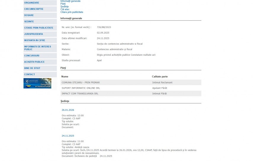 Pe rolul Curții de Apel Constanța se află dosarul 726/88/2023, înregistrat la data de 2 septembrie 2025 la Secţia de Contencios administrativ și fiscal ce are ca obiect „ litigiu privind achiziţiile publice Constatare nulitate act “. Procesul se află în stadiul de apel, iar ultima modificare a fost operată în data de 24 noiembrie 2025.Părți în dosar sunt Comuna Stejaru prin primar – Intimat Reclamant, Suport Informatic online SRL – Apelant Pârât și Impact Com Transilvania SRL – Intimat Pârât.