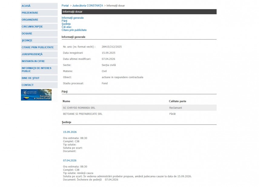 UPDATE. Justiție Constanța Chryso Romania, la judecată cu Betoane și Prefabricate SRL! Termen în septembrie 2026 la Judecătoria Constanța