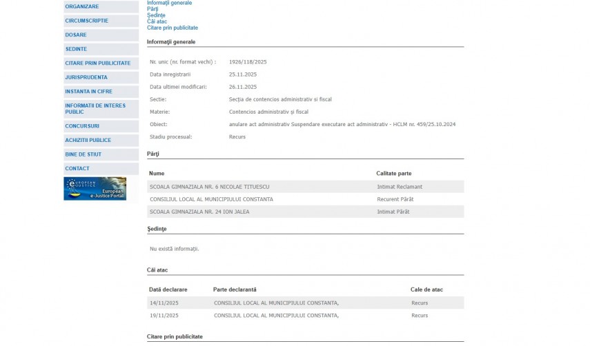 Pe rolul Curții de Apel Constanța se află dosarul cu numărul de înregistrare 1926/118/202521 înregistrat la data de 25 noiembrie 2025 la Secția e contencios administrativ si fiscal. Dosarul are ca obiect - anulare act administrativ Suspendare executare act administrativ - HCLM nr. 459/25.10.2024 și se află în stadiul procesual de recurs.Părți în dosar sunt Școala Gimnazială Nr. 6 Nicolae Titulescu - Intimat Reclamant, Consiliul Local al Municipiului Constanța - Recurent Pârât și Școala Gimnazială Nr. 24 Ion Jalea - Intimat Pârât.