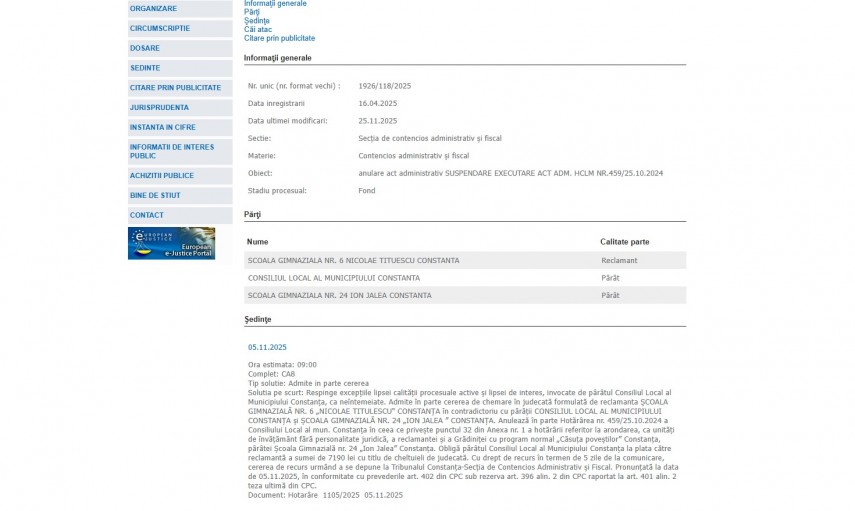 Solutia pe scurt: Respinge excepţiile lipsei calităţii procesuale active şi lipsei de interes, invocate de pârâtul Consiliul Local al Municipiului Constanţa, ca neîntemeiate. Admite în parte cererea de chemare în judecată formulată de reclamanta ŞCOALA GIMNAZIALĂ NR. 6 „NICOLAE TITULESCU" CONSTANŢA în contradictoriu cu pârâţii CONSILIUL LOCAL AL MUNICIPIULUI CONSTANŢA şi ŞCOALA GIMNAZIALĂ NR. 24 „ION JALEA ” CONSTANŢA. Anulează în parte Hotărârea nr. 459/25.10.2024 a Consiliului Local al mun. Constanţa în ceea ce priveşte punctul 32 din Anexa nr. 1 a hotărârii referitor la arondarea, ca unităţi de învăţământ fără personalitate juridică, a reclamantei şi a Grădiniţei cu program normal „Căsuţa poveştilor” Constanţa, pârâtei Şcoala Gimnazială nr. 24 „Ion Jalea” Constanţa. Obligă pârâtul Consiliul Local al Municipiului Constanţa la plata către reclamantă a sumei de 7190 lei cu titlu de cheltuieli de judecată. Cu drept de recurs în termen de 5 zile de la comunicare, cererea de recurs urmând a se depune la Tribunalul Constanţa-Secţia de Contencios Administrativ şi Fiscal. Pronunţată la data de 05.11.2025, în conformitate cu prevederile art. 402 din CPC sub rezerva art. 396 alin. 2 din CPC raportat la art. 401 alin. 2 teza ultimă din CPC“ – conform Portalului Instanțelor de Judecată.