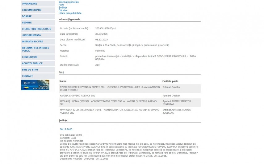 Pe rolul Curții de Apel Constanța se află dosarul 2629/118/2025/a1, înregistrat la data de 30 iulie 2025 la Secţia a II-a Civilă, ce are ca obiect „procedura insolvenţei – societăţi cu răspundere limitată DESCHIDERE PROCEDURĂ - LEGEA 85/2014“. Procesul se află în stadiul de apel, iar ultima modificare a fost operată în data de 8 decembrie 2025.Părți în dosar sunt River Bunker Shipping & Supply SRO cu Sediul Procesual Ales La Av.Mavrodin Ionut Tiberiu – intimat creditor și Karina Shipping Agency SRL- debitor, Karina Shipping Agency SRL prin administrator statutar Miclăuș Lucian-Ștefan - apelant administrator statutar și Karina Shipping Agency SRL prin administrator judiciar Mavrodin & CO Insolvency IPURL - intimat administrator judiciar.