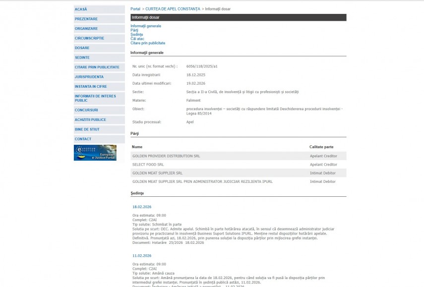 Pe rolul Curții de Apel Constanța se află dosarul 6056/118/2025/a1, înregistrat la data de 18 decembrie 2025 la Secţia a II-a civilă, de insolvenţă şi litigii cu profesionişti şi societăţi, ce are ca obiect „procedura insolvenţei – societăţi cu răspundere limitată Deschidererea procedurii insolvenţei - Legea 85/2014“. Procesul se află în stadiul de apel, iar ultima modificare a fost operată în data de 19 februarie 2026.Părți în dosar sunt Golden Meat Supplier SRL – intimat debitor și Golden Meat Supplier SRL prin administrator judiciar Rezilienta IPURL - intimat debitor, dar și Golder Provider Distribution SRL și Select Food - Apelant Creditor.