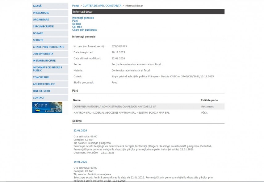 Pe rolul Curții de Apel Constanța se află dosarul 675/36/2025 în care părți sunt Compania Națională Administrația Canalelor Navigabile SA– reclamant și Navtron SRL-lider al asocierii Navtron SRL - Eletro Scoica Mar SRL, iar vizată este decizia CNSC nr. 3470/C10/2691/10.12.2025.Mai exact, obiectul dosarului îl reprezintă litigiu privind achiziţiile publice Plângere - Decizia CNSC nr. 3740/C10/2681/10.12.2025.