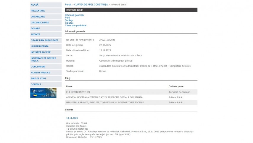 Pe rolul Curții de Apel Constanța se află dosarul 3782/118/2025, înregistrat la data de 22 septembrie 2025 la Secţia de contencios administrativ si fiscal ce are ca obiect „suspendare executare act administrativ Decizia nr. 144/21.07.2025 - Completare hotărâre“. Procesul se află în stadiul de recurs, iar ultima modificare a fost operată în data de 29 octombrie 2025.Părți în dosar sunt Ela Meridian Vie SRL - recurent Reclamant, Agenția Județeană pentru Plăți și Inspecție Socială Constanța- Intimat Pârât și Ministerul Muncii, Familiei, Tineretului și Solidarității Sociale - Intimat Pârât.