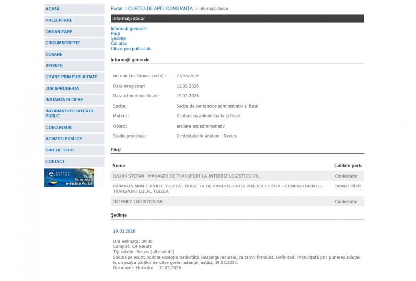 Pe rolul Curții de Apel Constanța se află dosarul 77/36/2024, înregistrat la data de 12 februarie 2026 la Secţia de Contencios administrativ și fiscal ce are ca obiect „ anulare act administrativ“. Procesul se află în stadiul de contestație în anulare - recurs, iar ultima modificare a fost operată în data de 12 februarie 2026.Părți în dosar sunt Iulian Ștefan - Manager de Transport la Interbiz Logistics SRL– contestator, Primaria Municipiului Tulcea - Direcția de Administrație Publică Locală - Compartimentul Transport Local Tulcea – intimat pârât și Interbiz Logistics SRL– contestator.