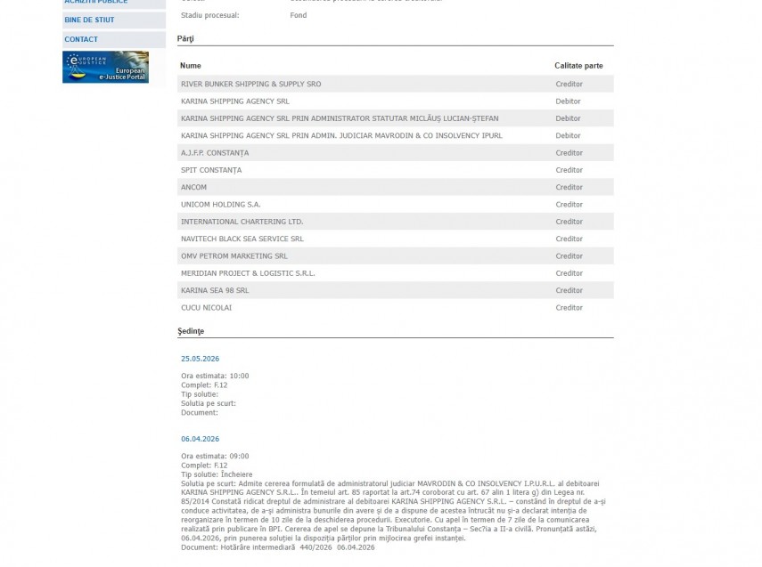 La termenul din 6 aprilie 2026 instanța a decis că firma Karina Shipping Agency S.R.L. nu mai poate să își gestioneze singură afacerea sau bunurile. Astfel, administratorii firmei nu mai pot lua decizii sau face plăți.