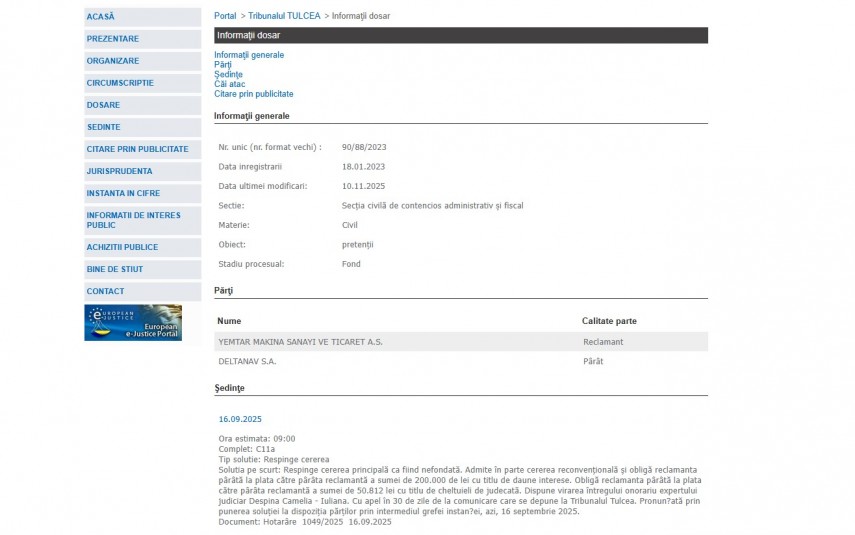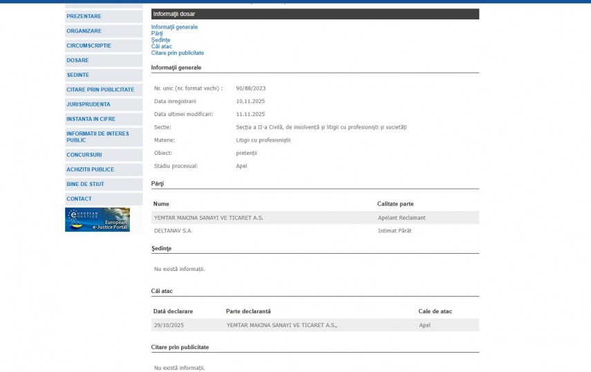 Pe rolul Curții de Apel Constanța a fost înregistrat la data de 10 noiembrie 2025 dosarul 90/88/2025 la Secţia a II-a Civilă, de insolvenţă şi litigii cu profesionişti şi societăţi ce are ca obiect „ pretenții“. Procesul se află în stadiul de apel, iar ultima modificare a fost operată în data de 11 noiembrie 2025.Părți în dosar sunt Yemtar Makina Sanayi Ve Ticaret A.S. - Apelant Reclamant și Deltanav SA – intimat pârât.