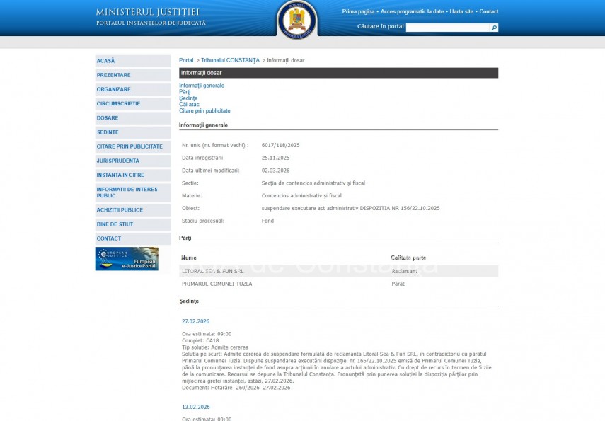 Solutia pe scurt: Admite cererea de suspendare formulată de reclamanta Litoral Sea & Fun SRL, în contradictoriu cu pârâtul Primarul Comunei Tuzla. Dispune suspendarea executării dispoziţiei nr. 165/22.10.2025 emisă de Primarul Comunei Tuzla, până la pronunţarea instanţei de fond asupra acţiunii în anulare a actului administrativ. Cu drept de recurs în termen de 5 zile de la comunicare. Recursul se depune la Tribunalul Constanţa. Pronunţată prin punerea soluţiei la dispoziţia părţilor prin mijlocirea grefei instanţei, astăzi, 27.02.2026“ - conform Portalului Instanțelor de Judecată.