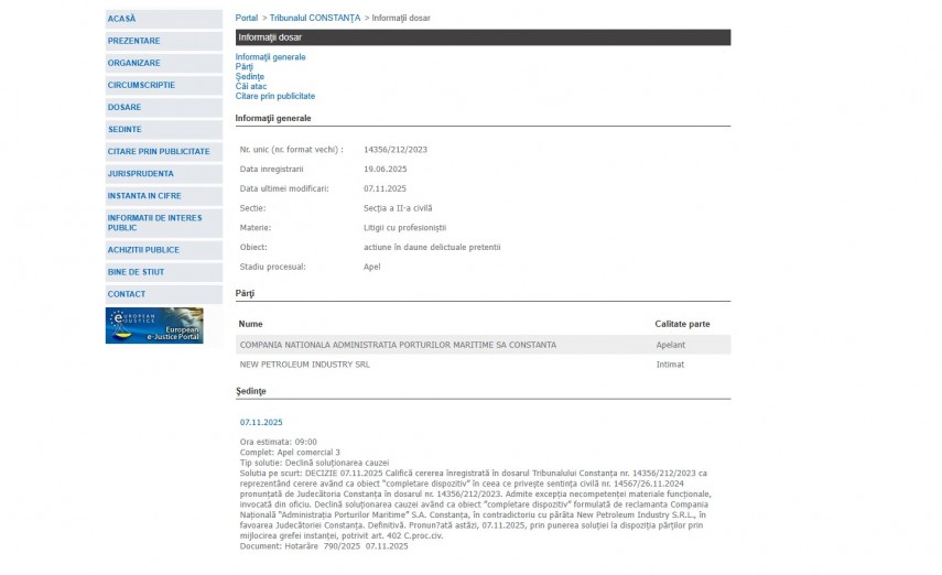 Solutia pe scurt: DECIZIE 07.11.2025 Califică cererea înregistrată în dosarul Tribunalului Constanţa nr. 14356/212/2023 ca reprezentând cerere având ca obiect “completare dispozitiv” în ceea ce priveşte sentinţa civilă nr. 14567/26.11.2024 pronunţată de Judecătoria Constanţa în dosarul nr. 14356/212/2023. Admite excepţia necompetenţei materiale funcţionale, invocată din oficiu. Declină soluţionarea cauzei având ca obiect ”completare dispozitiv” formulată de reclamanta Compania Naţională “Administraţia Porturilor Maritime” S.A. Constanţa, în contradictoriu cu pârâta New Petroleum Industry S.R.L., în favoarea Judecătoriei Constanţa. Definitivă. Pronun?ată astăzi, 07.11.2025, prin punerea soluţiei la dispoziţia părţilor prin mijlocirea grefei instanţei, potrivit art. 402 C.proc.civ.“ - conform Portalului Instanțelor de Judecată.
