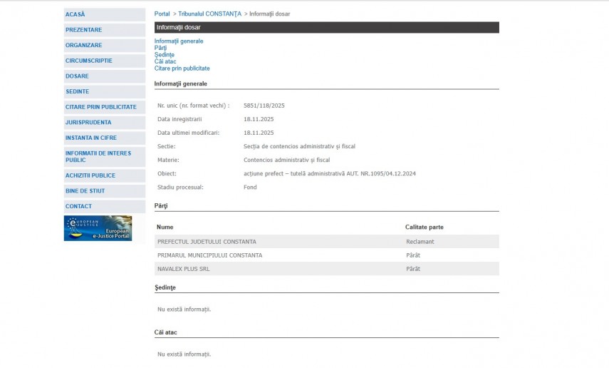 Pe rolul Tribunalului Constanța a fost înregistrat la data de 18 noiembrie 2025 dosarul 5851/118/2025 la Secția de contencios administrativ și fiscal ce are ca obiect - acțiune prefect – tutelă administrative AUT nr. 1095/04.12.2024.Momentan nu a fost fixat termen de judecată.