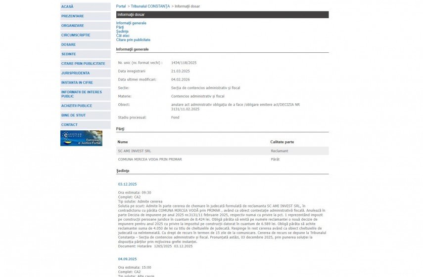 „Solutia pe scurt: Admite în parte cererea de chemare în judecată formulată de reclamanta SC AMI INVEST SRL, în contradictoriu cu pârâta COMUNA MIRCEA VODĂ prin PRIMAR , având ca obiect contestaţie administrativă fiscală. Anulează în parte Decizia de impunere pe anul 2025 nr.3131/11 februarie 2025, respectiv numai cu privire la pct. 1 reprezentând impozit pe construcţii persoane juridice în cuantum de 8.424 lei. Obligă pârâta să emită pe numele reclamantei o nouă decizie de impunere pentru anul 2025 cu privire la impozitul pe construcţii datorat în cuantum de 6.589 lei. Obligă pârâta să achite reclamantei suma de 4.050 de lei cu titlu de cheltuielile de judecată. Respinge în rest cererea având ca obiect cheltuielile de judecată ca neîntemeiată. Cu drept de recurs în termen de 15 zile de la comunicare. Cererea de recurs se depune la Tribunalul Constanţa – Secţia de contencios administrativ şi fiscal. Pronunţată astăzi, 03 decembrie 2025, prin punerea soluţiei la dispoziţia părţilor prin mijlocirea grefei instanţei“ – conform Portalului Instanțelor de Judecată.