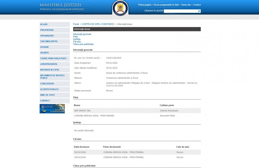 Pe rolul Curții de Apel Constanța a fost înregistrat dosarul 1434/118/2025 la data de 4 februarie 2026. Dosarul a fost înregistrat la Secția de contencios administrativ si fiscal și are ca obiect „ anulare act administrativ Obligaţia de a face - Obligare emitere act administrativ - Decizia nr. 3131/11.02.2025 “. Dosarul este în stadiul procesual – recurs și ultima modificare a fost efectuată la data de 4 februarie 2026.Părți în dosar sunt Ami Invest SRL – Intimat Reclamant și Comuna Mircea Vodă prin primar – recurent pârât.