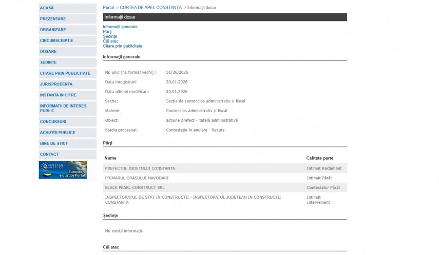 Pe rolul Curții de Apel Constanța a fost înregistrat dosarul 51/36/2026 la data de 30 ianuarie 2026. Dosarul a fost înregistrat la Secția de contencios administrativ si fiscal și are ca obiect „ acţiune prefect – tutelă administrativă “. Dosarul este în stadiul procesual – contestație în anulare și ultima modificare a fost efectuată la data de 30 ianuarie 2026.Părți în dosar sunt Prefectul Județului Constanța – Intimat Reclamant, Primarul Orașului Năvodari – Intimat Pârât, Black Pearl Construct SRL – contestator Pârât și Inspectoratul de Stat în Construcții – Inspectoratul Județean în Construcții Constanța – Intimat Intervenient.