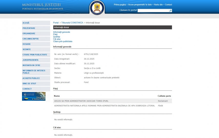 Pe rolul Tribunalului Constanța a fost înregistrat la data de 30 decembrie 2025 dosarul 6751/118/2025 ce are ca obiect acțiune în daune contractuale pretenții. Contractul se află la Secția a II/a Civilă și se află în stadiu procesual de fond.Părți în dosar sunt Argos SA prin administrator judiciar Tomis IPURL – reclamant și Administrația Națională Apele Române prin Administrația Bazinală de Apă Dobrogea Litoral – pârât.