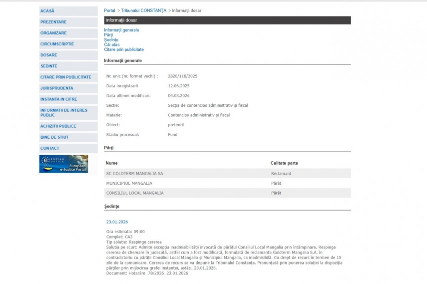 Solutia pe scurt: Admite excepţia inadmisibilităţii invocată de pârâtul Consiliul Local Mangalia prin întâmpinare. Respinge cererea de chemare în judecată, astfel cum a fost modificată, formulată de reclamanta Goldterm Mangalia S.A. în contradictoriu cu pârâţii Consiliul Local Mangalia şi Municipiul Mangalia, ca inadmisibilă. Cu drept de recurs în termen de 15 zile de la comunicare. Cererea de recurs se va depune la Tribunalul Constanţa. Pronunţată prin punerea soluţiei la dispoziţia părţilor prin mijlocirea grefei instanţei, astăzi, 23.01.2026“ – conform Portalului Instanțelor de Judecată.
