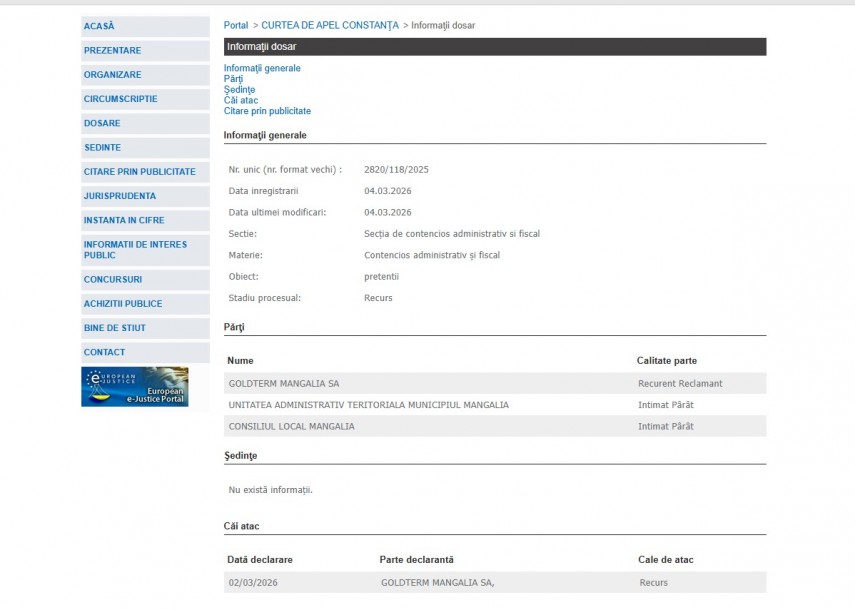 Pe rolul Curții de Apel Constanța a fost înregistrat dosarul cu numărul 2820/118/2025 la data de 4 martie 2026. Acesta se află la Secția de Contencios Administrativ și Fiscal, iar obiectul este „pretenții“. Stadiul procesual este recurs.Părți în dosar sunt Goldterm Mangalia SA – recurent reclamant, UAT Municipiul Mangalia și Consiliul Local Mangalia – Intimați Pârâți.