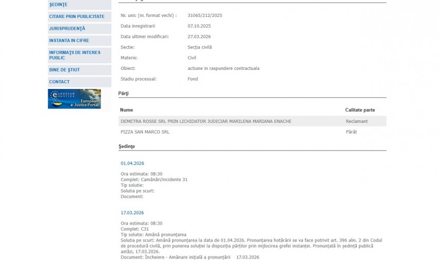 Solutia pe scurt: Amână pronunţarea la data de 01.04.2026. Pronunţarea hotărârii se va face potrivit art. 396 alin. 2 din Codul de procedură civilă, prin punerea soluţiei la dispoziţia părţilor prin mijlocirea grefei instanţei. Pronunţată în şedinţă publică astăzi, 17.03.2026“ - conform Portalului Instanțelor de Judecată.