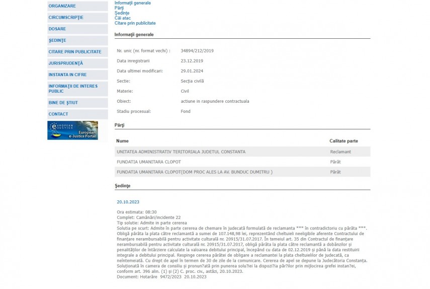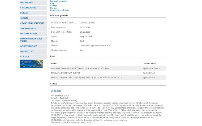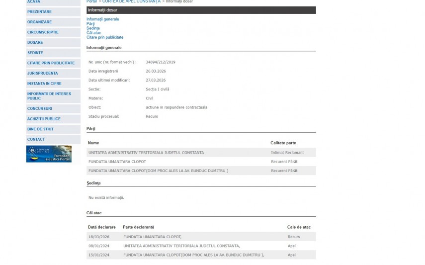 Pe rolul Curții de Apel Constanța a fost înregistrat dosarul cu numărul 34894/212/2019 la data de 26 martie 2026. Acesta se află la Secția I Civilă, iar obiectul este „ actiune in raspundere contractuala “. Stadiul procesual este recurs.Părți în dosar sunt Unitatea Administrativ Teritorială Județul Constanța - Intimat Reclamant, Fundatia Umanitara Clopot - Recurent Pârât și Fundatia Umanitara Clopot (Dom Proc ales la Av. Bunduc Dumitru) - Recurent Pârât.