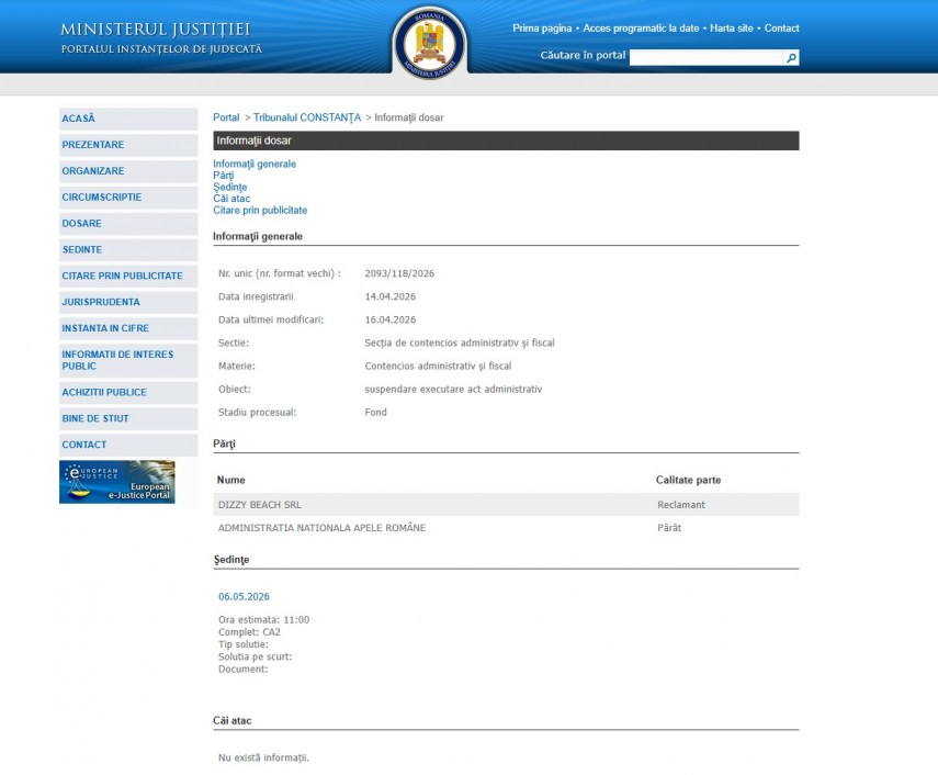 Pe rolul Tribunalului Constanța a fost înregistrat la data de 14 aprilie 2026 dosarul 2093/118/2026 la Secția de contencios administrativ şi fiscal.Potrivit portalului instanțelor de judecată obiectul dosarului este „suspendare executare act administrativ“, stadiul procesual fiind Fond.