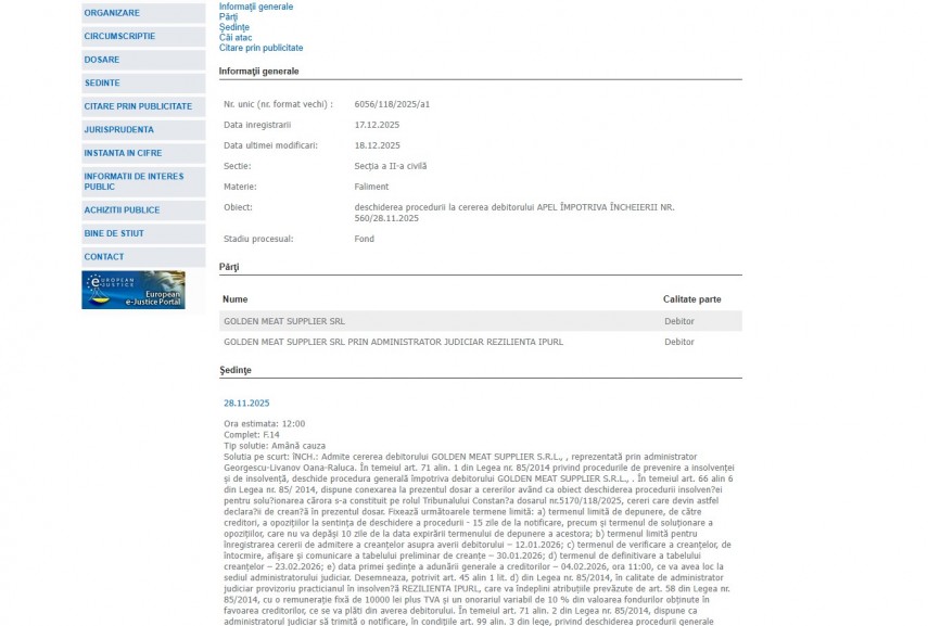 Dosarul s-a mai aflat și în atenția magistrațilpor de la Tribunalul Constanța care la data de 28 noiembrie 2025 a amânat cauza și a deschis procedura generală împotriva debitorului Golden Meat Supplier S.R.L.