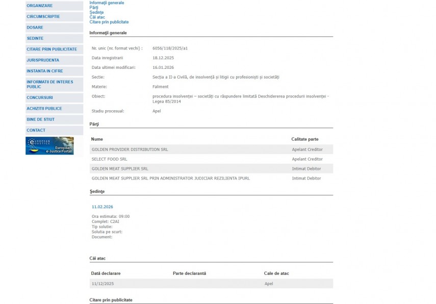 Pe rolul Curții de Apel Constanța se află dosarul 6056/118/2025/a1, înregistrat la data de 18decembrie 2025 la Secţia a II-a civilă, de insolvenţă şi litigii cu profesionişti şi societăţi, ce are ca obiect „procedura insolvenţei – societăţi cu răspundere limitată Deschidererea procedurii insolvenţei - Legea 85/2014“. Procesul se află în stadiul de apel, iar ultima modificare a fost operată în data de 16 ianuarie 2026. Părți în dosar sunt Golden Meat Supplier SRL – intimat debitor și Golden Meat Supplier SRL prin administrator judiciar Rezilienta IPURL - intimat debitor, dar și Golder Provider Distribution SRL și Select Food - Apelant Creditor.