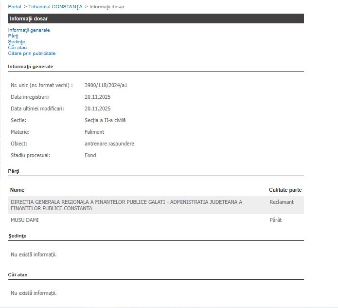 La Tribunalul Constanța a fost înregistrat un nou dosar în materie civilă, secția a II-a civilă, având ca obiect faliment și antrenarea răspunderii. Dosarul, cu numărul unic 3900/118/2024/a1, a fost înregistrat pe data de 20 noiembrie 2025 și se află în stadiul de fond.