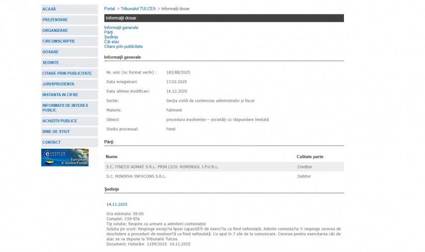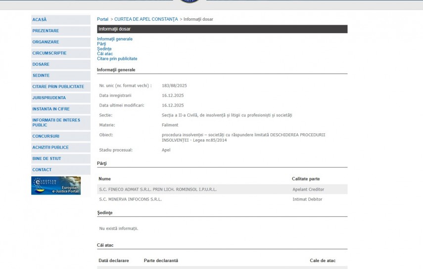 Pe rolul Curții de Apel Constanța se află dosarul cu numărul de înregistrare 183/88/2025 înregistrat la data de 16 decembrie 2025 la Secția a II-a Civilă, de insolvenţă şi litigii cu profesionişti şi societăţi. Dosarul are ca obiect procedura insolvenţei – societăţi cu răspundere limitată DESCHIDEREA PROCEDURII INSOLVENŢEI - Legea nr.85/2014 și se află în stadiul procesual de apel.Părți în dosar sunt S.C. FINECO ADMAT S.R.L. PRIN LICH. ROMINSOL I.P.U.R.L.– Apelant Creditor și S.C. MINERVA INFOCONS S.R.L.– Intimat Debitor.