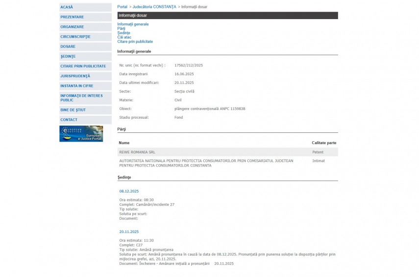 Pe rolul Judecătoriei Constanța se află un dosar prin care Rewe Romania, firma pe care funcționează magazinele Penny România contestă o amendă primită de la ANPC.Este vorba despre dosarul 17562/212/2025 (înregistrat la data de 16 iunie 2025).