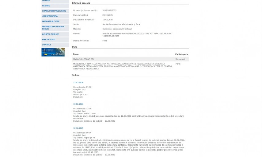Pe rolul Tribunalului Constanța se află dosarul 5208/118/2025, înregistrat la data de 20 octombrie 2025 la Secţia de contencios administrativ şi fiscal ce are ca obiect „anulare act administrativ SUSPENDARE EXECUTARE ACT ADM. DEC.NR.A-FCT 19880/29.09.2025“. Procesul se află în stadiul de fond, iar ultima modificare a fost operată în data de 10 februarie 2026Părți în dosar sunt Mvua Solutions SRL – reclamant și Ministerul Finantelor-Agentia Nationala de Administratie Fiscala-Directia Generala Antifrauda Fiscala-Directia Regionala Antifrauda Fiscala Nr.2 Constanta-Sectia de Control Antifrauda Fiscala Nr.3.
