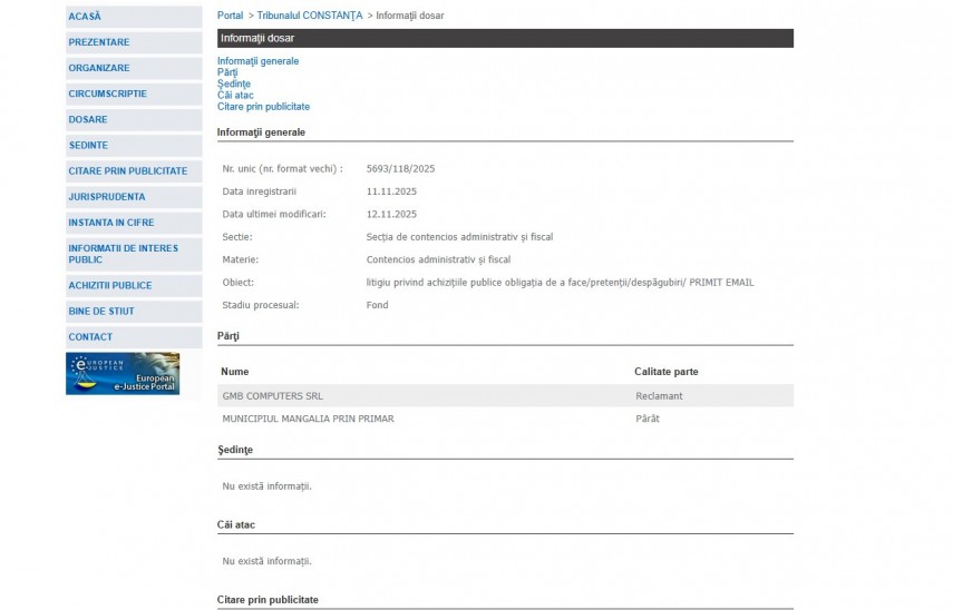 Pe rolul Tribunalului Constanța a fost înregistrat la data de 11 noiembrie 2025 dosarul 5693/118/2025 la Secţia de contencios administrativ şi fiscal, ce are ca obiect „ litigiu privind achiziţiile publice obligaţia de a face/pretenţii/despăgubiri/ PRIMIT EMAIL “. Procesul se află în stadiul de fond, iar ultima modificare a fost operată în data de 12 noiembrie 2025.Părți în dosar sunt GMB Computers - Reclamant și Municipiul Mangalia prin Primar - pârât.