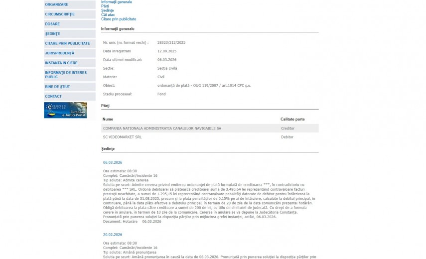La termenul din 6 martie 2026, magistrații au admis cererea privind emiterea ordonanţei de plată formulată de creditoarea Compania Națională Administrația Canalelor Navigabile SA , în contradictoriu cu debitoarea Videomarket SRL.