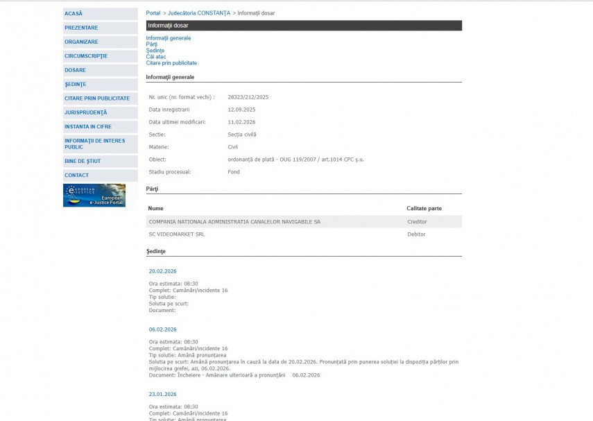 Pe rolul Judecătoriei Constanța se află dosarul 28323/212/2025 înregistrat la data de 12 septembrie 2025 la Secţia Civilă ce are ca obiect „ordonanţă de plată - OUG 119/2007 / art.1014 CPC ş.u. “. Procesul se află în stadiul de fond, iar ultima modificare a fost operată în data de 23 ianuarie 2026.Părți în dosar sunt Compania Națională Administrația Canalelor Navigabile SA – creditor și SC Videomarket SRL – intimat.