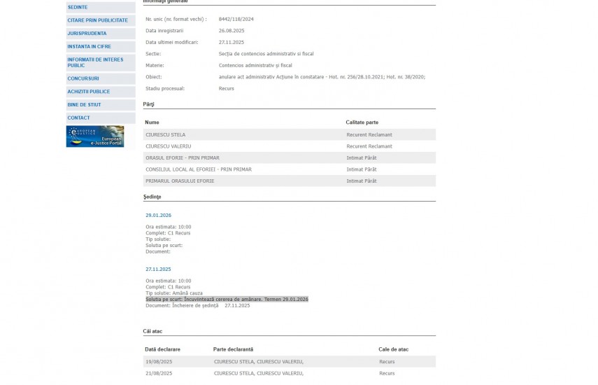 Pe rolul Curții de Apel Constanța se află dosarul 8442/118/2024, înregistrat la data de 26 august 2025 la Secţia de Contencios administrativ și fiscal ce are ca obiect „ anulare act administrativ Acţiune în constatare - Hot. nr. 256/28.10.2021; Hot. nr. 38/2020; “. Procesul se află în stadiul de recurs, iar ultima modificare a fost operată în data de 27 noiembrie 2025.Părți în dosar sunt Stela Ciurescu și Valentin Ciurescu – recurenți reclamanți și Orașul Eforie prin primar, Consiliul Local al Orașului Eforie prin primar și Primarul Orașului Eforie – Intimați Pârâți.