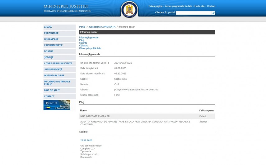 Pe rolul Judecătoriei Constanța se află dosarul 15619/212/2025, înregistrat la data de 1 septembrie 2025 la Secţia Civilă ce are ca obiect „plângere contravenţională DGAF 0037709“. Procesul se află în stadiul de fond, iar ultima modificare a fost operată în data de 1 septembrie 2025.Părți în dosar sunt SC MNS Agregate Piatra SRL – petent și Agenția Națională de Administrare Fiscală prin Direcția Generală Antifraudă Fiscală 2 Constanța.