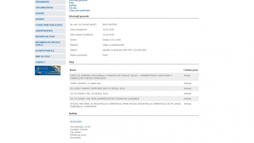 Pe rolul Tribunalului Constanța a fost înregistrat la data de 16 februarie 2026 dosarul 862/118/2026 la Secția a II-a Civilă ce are ca obiect „opoziţie la dizolvare IMP HOT 1/12.08.2025“. părți în dosar sunt Direcția Generală Regională a Finanțelor Publice Galați - Administrația Județeană a Finanțelor Publice Constanța - petent, Tonev Georgy, Es Legacy Energy Ventures Sro, Go To Agency SRL, Go To Agency SRL prin Administrator Tolmaciov Alexandr și Oficiul Național al Registrului Comerțului prin Oficiul Registrului Comerțului de pe lângă Tribunalul Constanța – intimați.Primul termen din acest dosar a fost fixat pentru data de 5 mai 2026.