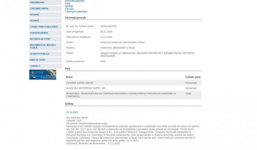 La primul termen din dosar, ce a avut loc la data de 27 noiembrie 2025 instanța a declinat soluționarea cauzei în favoarea completurilor civile nespecializate în materia achizițiilor publice din cadrul Tribunalului Constanţa – Secţia de contencios administrativ şi fiscal.