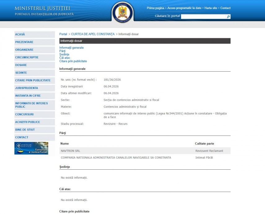 Pe rolul Curții de Apel Constanța a fost înregistrat la data de 6 aprilie dosarul 181/36/2026 la secția de contencios administrative și fiscal.Potrivit portalului instanțelor de judecată obiectul dosarului este „comunicare informaţii de interes public (Legea Nr.544/2001) Acţiune în constatare - Obligaţia de a face“, stadiul procesual fiind revizuire-recurs.