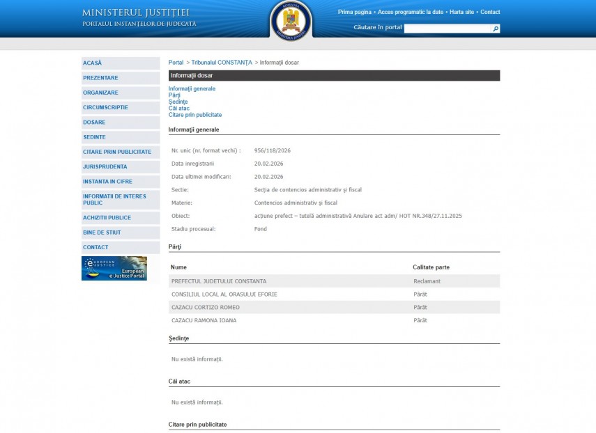Pe rolul Tribunalului Constanța a fost înregistrat dosarul 956/118/2026 la data de 20 februarie 2026 ce are ca obiect „acţiune prefect – tutelă administrativă Anulare act adm/ HOT NR.348/27.11.2025“. Stadiul procesual este fond, iar ultima modificare a fost procesată la data de 20 februarie 2026.Părți în dosar sunt Prefectul Județului Constanța – Reclamant, Consiliul Local Al Orasului Eforie, Cazacu Cortizo Romeo și Cazacu Ramona Ioana – Pârâți.
