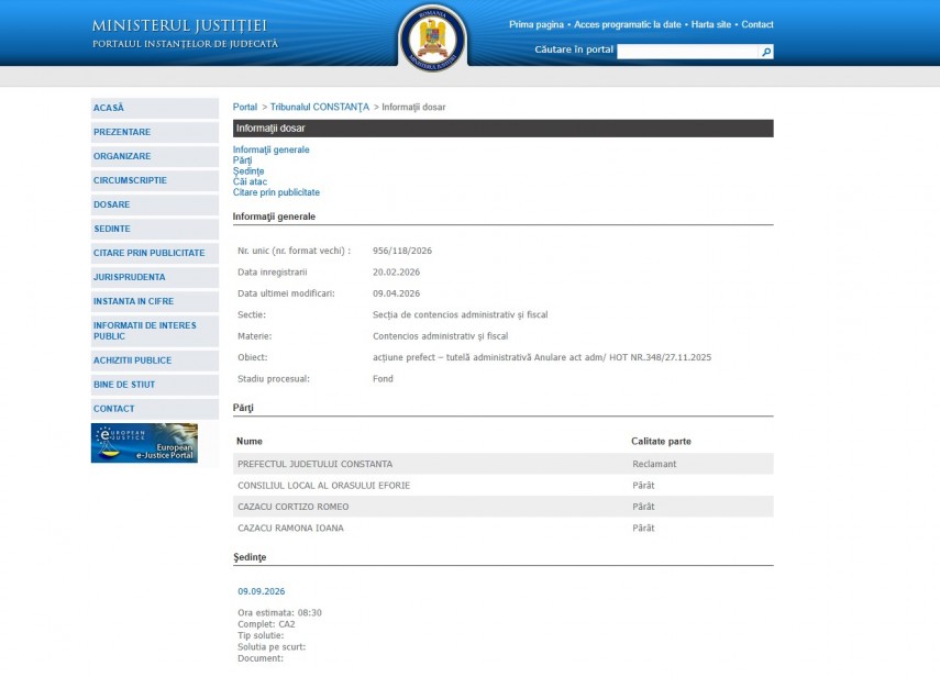 Pe rolul Tribunalului Constanța a fost înregistrat dosarul 956/118/2026 la data de 20 februarie 2026 ce are ca obiect „acţiune prefect – tutelă administrativă Anulare act adm/ HOT NR.348/27.11.2025“. Stadiul procesual este fond, iar ultima modificare a fost procesată la data de 20 februarie 2026.Părți în dosar sunt Prefectul Județului Constanța – Reclamant, Consiliul Local Al Orasului Eforie, Cazacu Cortizo Romeo și Cazacu Ramona Ioana – Pârâți.
