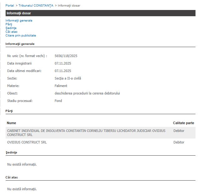 Dosarul se află în stadiul procesual de fond și privește societatea Ovidius Construct SRL, care figurează atât ca debitor, cât și prin Cabinetul Individual de Insolvență Constantin Corneliu Tiberiu, desemnat lichidator judiciar.