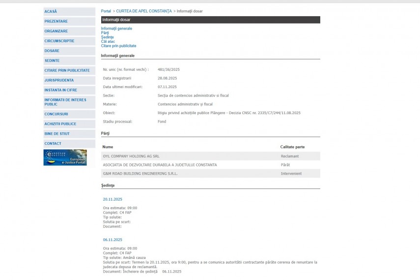 La Curtea de Apel Constanța a avut loc la data de 6 noiembrie 2025 un termen în dosarul nr. 481/36/2025, aflat pe rolul Secției de contencios administrativ și fiscal. Dosarul are ca obiect un litigiu în materie de achiziții publice.Reclamant este societatea OYL Company Holding AG SRL din Slobozia, iar pârâtă este Asociația de Dezvoltare Durabilă a Județului Constanța.