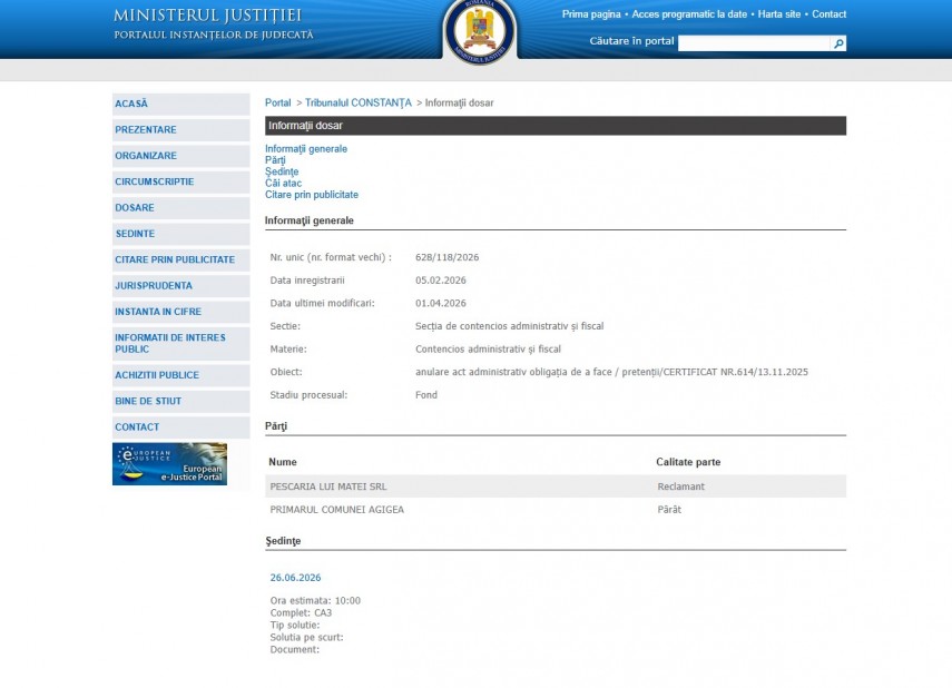Pe rolul Judecătoriei Constanța a fost înregistrat dosarul 628/118/2026 la data de 4 februarie 2026. Dosarul a fost înregistrat la Secţia de contencios administrativ şi fiscal și are ca obiect „anulare act administrativ obligaţia de a face / pretenţii/CERTIFICAT NR.614/13.11.2025 “. Dosarul este în stadiul procesual – fond și ultima modificare a fost efectuată la data de 4 februarie 2026.Părți în dosar sunt Pescăria lui Matei SRL – reclamant și Primăria Comunei Agigea – pârât. .