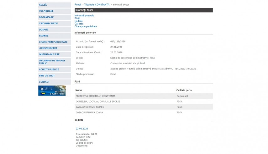 Pe rolul Tribunalului Constanța a fost înregistrat dosarul 417/118/2026 la data de 27 ianuarie 2026. Dosarul a fost înregistrat la Secția de contencios administrativ şi fiscal și are ca obiect „acţiune prefect – tutelă administrativă anulare act adm/HOT NR 233/31.07.2025“. Dosarul este în stadiul procesual – fond și ultima modificare a fost efectuată la data de 26 martie 2026.Părți în dosar sunt Prefectul Județului Constanța – reclamant, Consiliul Local al Orașului Eforie, Cazacu Cortizo Romeo și Cazacu Ramona Ioana – pârâți.