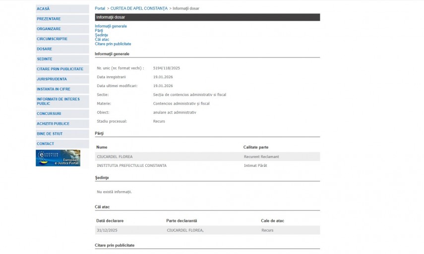 Pe rolul Curții de Apel Constanța a fost înregistrat dosarul 5194/118/2025 la data de 19 ianuarie 2026. Dosarul a fost înregistrat la Secţia de contencios administrativ si fiscal și are ca obiect „ anulare act administrativ“. Dosarul este în stadiul procesual – recurs și ultima modificare a fost efectuată la data de 19 ianuarie 2026.Părți în dosar sunt Florea Ciucardel – recurent reclamant și Instituția Prefectului Constanța – intimat pârât.